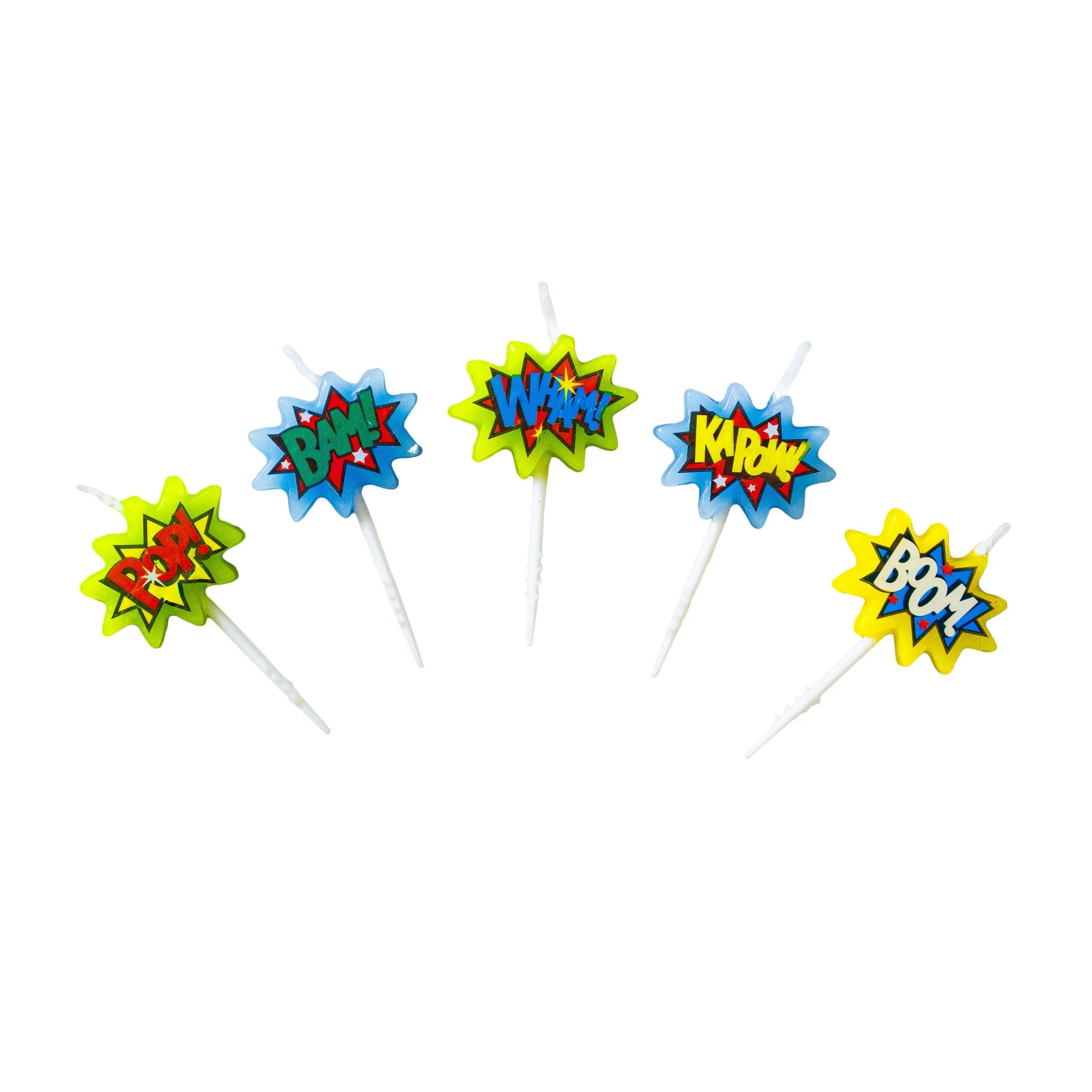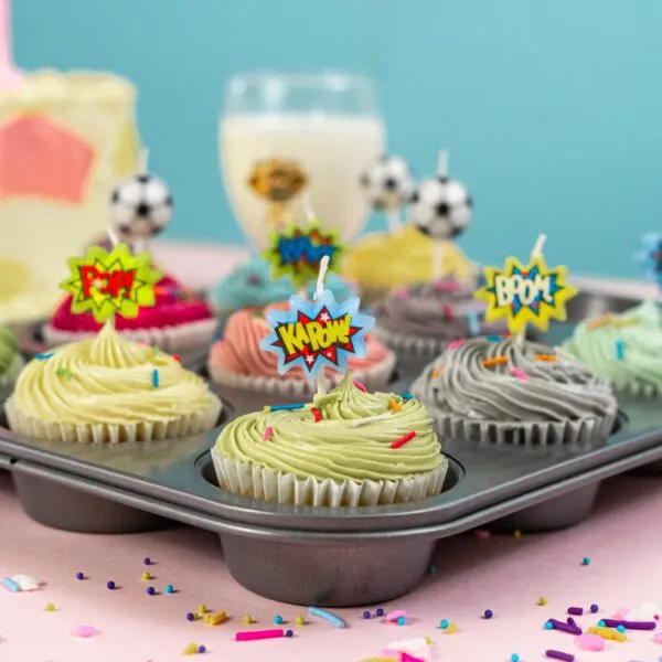 Velas Boom! Baw! Pop! hechas de cera de alta calidad, estas velas cuentan con expresiones vibrantes como “Boom!”, “Bam!” y “Pop!” que capturan la emoción del momento. Su base segura garantiza estabilidad en cualquier pastel, asegurando que tu celebración sea tan increíble como inolvidable.