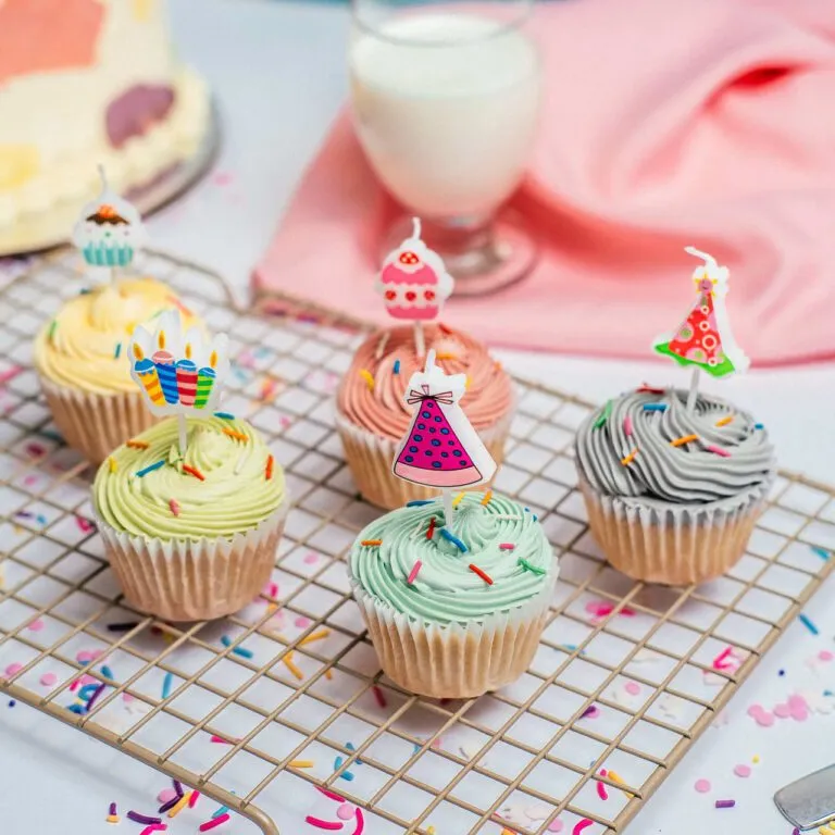📦 Contenido: 5 velas de fiesta con figuras de gorritos, cupcakes y velas decorativas